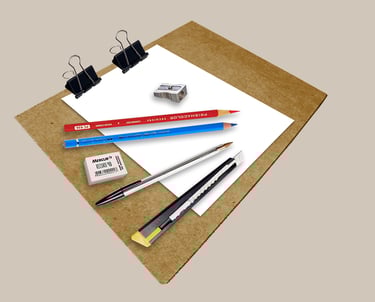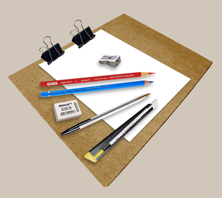 Presilhas, Papel A4, (Lápis azul e/ou Lápis vermelho- opcional), Borracha branca, Lápis nº 2 ou lapiseira 0.5mm e/ou 0.9mm, Apontador ou estilete, Prancheta 50 x 40 cm(opcional), Caneta Bic preta ou a Nanquim.
