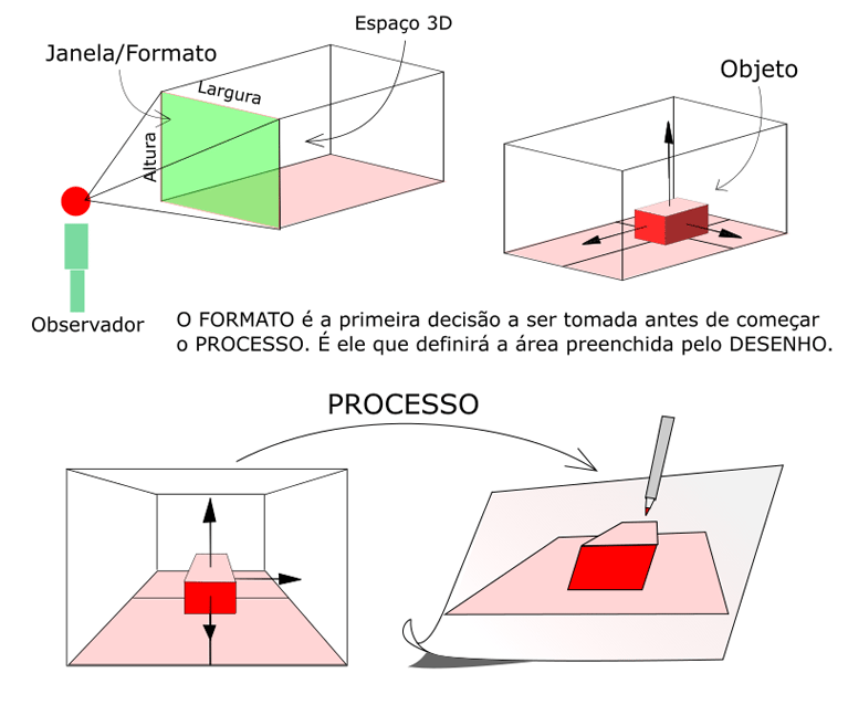 OBSERVADOR(CÂMERA), ESPAÇO(FORMATO) E OBJETOS. Ou ainda, DESENHISTA, PAPEL E DESENHO.