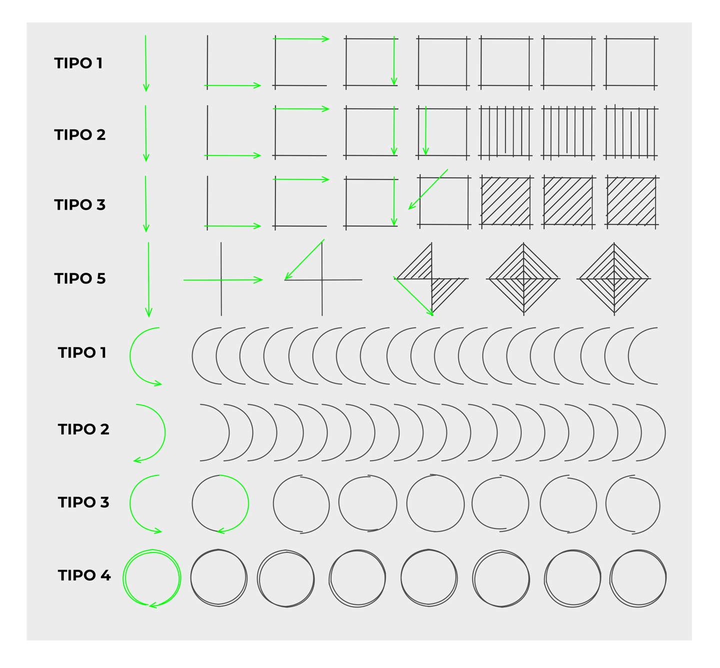 Treine preenchendo folhas de papel até sentir-se seguro na construção de linhas retas e curvas, no controle da mão e no controle dos espaços e tamanhos das formas desenhadas.